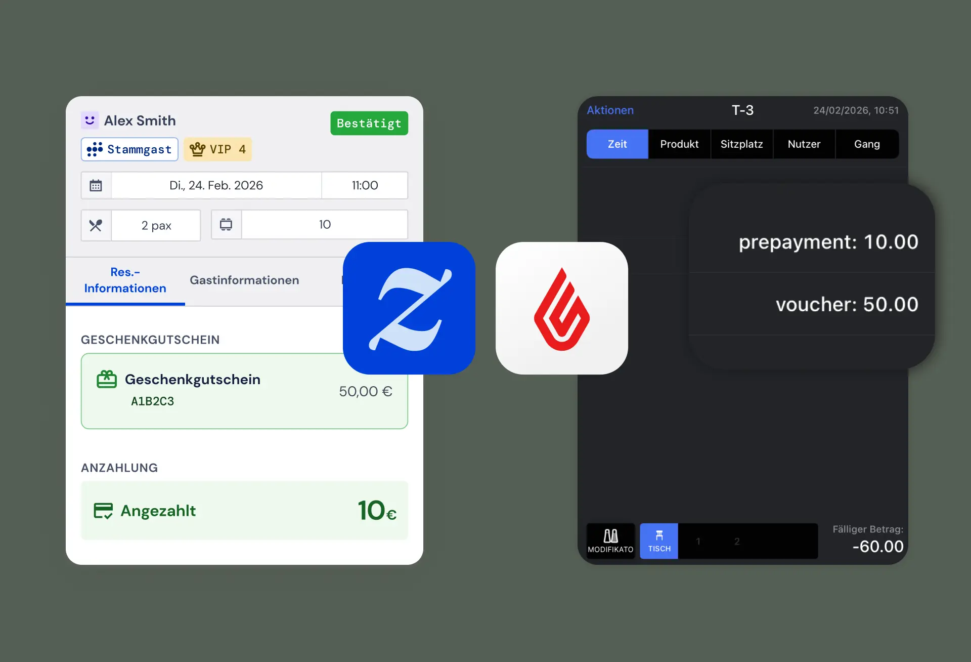 - Wird in Lightspeed eine Bestellung eröffnet, wird automatisch eine Walk-in-Reservierung in Zenchef erstellt.